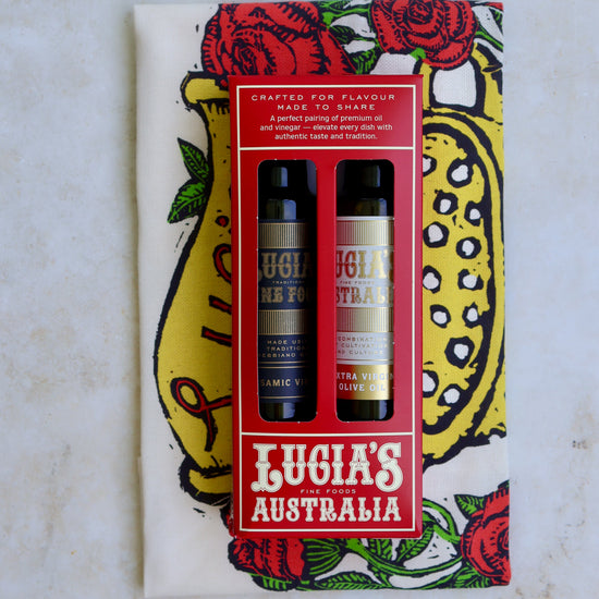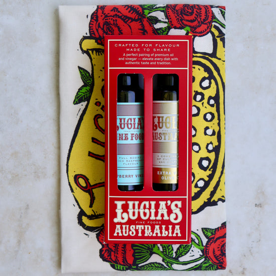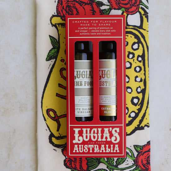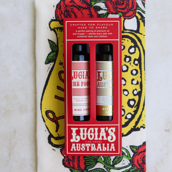 A timeless kitchen essential, beautifully wrapped for the festive season. Our Extra Virgin Olive Oil & Vinegar Gift Pack pairs rich, Australian olive oil with a perfect Italian vinegar, finished with a charming Lucia's tea towel to complete the set.